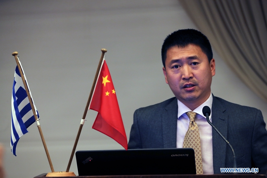 Gao Wenqi, Charge d'affaires from the Chinese Embassy in Greece, gives a speech during the Greek-Chinese economic conference under the theme of the Belt and Road in Athens, Greece, May 11, 2017. Greek officials and scholars on Thursday hailed the results of Greek-Chinese cooperation at Piraeus port in recent years, and expressed confidence of more remarkable benefits for Greece and China in the future under the Belt and Road Initiative. (Xinhua/Marios Lolos)