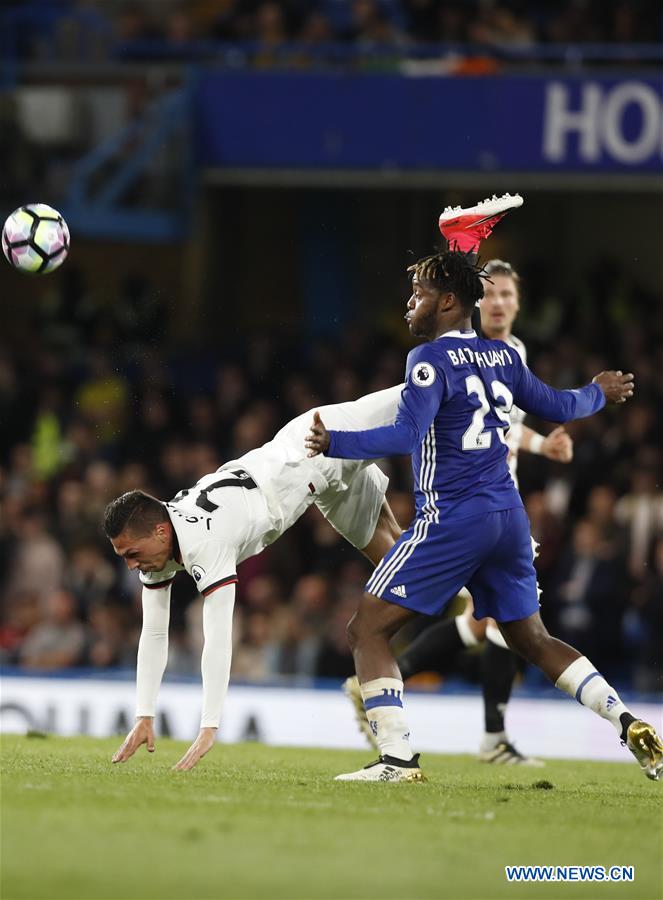 Jose Holebas (L) of Watford vies with Michy Batshuayi of Chelsea during the English Premier League match between Chelsea and Watford at the Stamford Bridge Stadium in London, Britain on May 15, 2017. Chelsea won 4-3. (Xinhua/Han Yan)