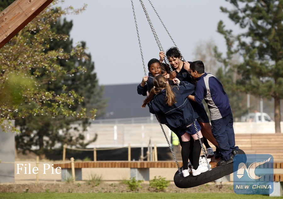 Kids from London Chobham Academy School play in the children's play areas in the newly transformed south of Queen Elizabeth Olympic Park on April 2, 2014 before it opens to the public on 5 April 2014 for the first time since London Olympic Games 2012. (Xinhua/Wang Lili)