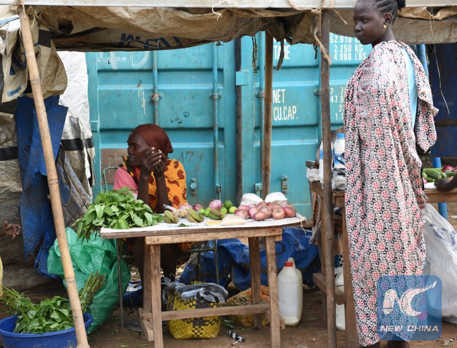 A refugee sells vegetables inside the Protection of Civilians site 1 of the United Nations Mission In South Sudan (UNMISS) in Juba, capital of South Sudan, Aug. 10, 2016. (Xinhua/Li Baishun)