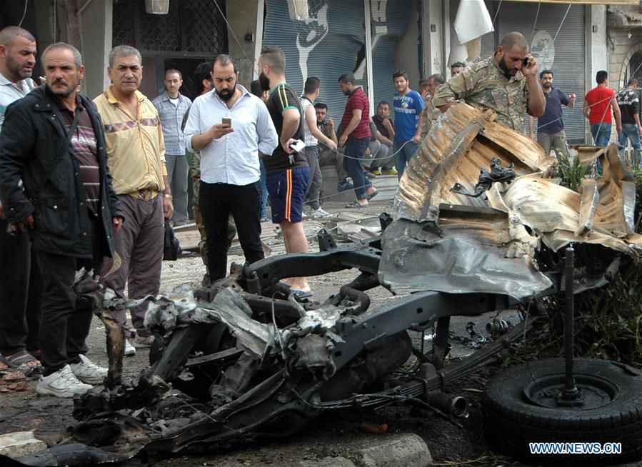 People gather at the al-Zahra'a neighborhood in Syria's central city of Homs following the blast on May 23, 2017. A car bomb went off in Syria's central city of Homs on Tuesday, killing three and wounding 15 others, just a couple of days after the city was declared free of rebels, state TV reported. (Xinhua/Ammar Safarjalani)