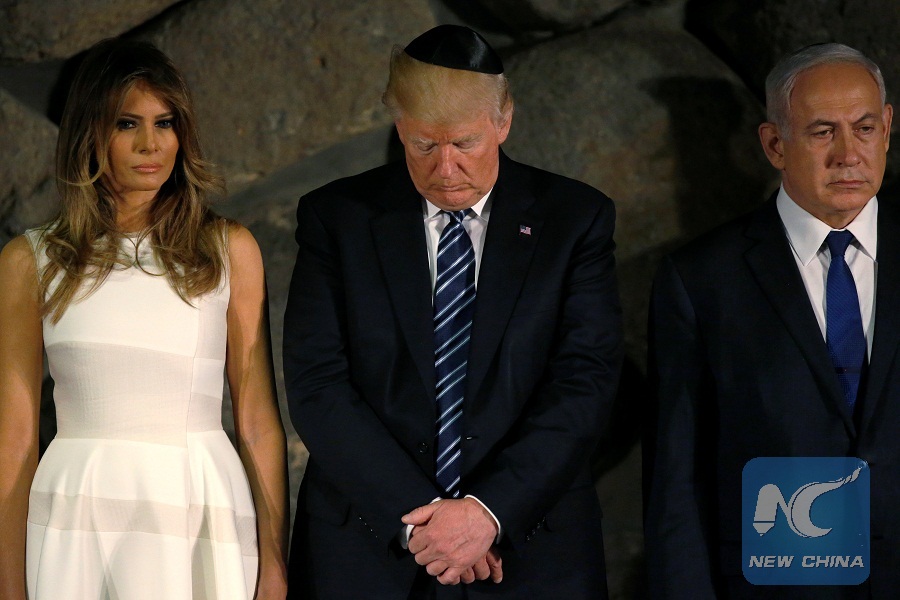 U.S. President Donald Trump and first lady Melania Trump (L) participate in a wreath-laying with Israel's Prime Minister Benjamin Netanyahu(R) at the Yad Vashem holocaust memorial in Jerusalem May 23, 2017. (Xinhua/Reuters Photo)