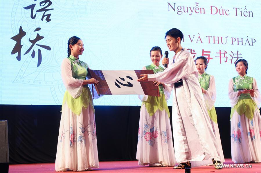 Nguyen Duc Tien (R, Front), student at the Faculty of Oriental Studies of the Ho Chi Minh City University of Social Sciences and Humanities, competes at the 16th "Chinese Bridge", the annual Chinese Proficiency Competition for Foreign College Students, in Ho Chi Minh City, Vietnam, on May 26, 2017. Themed "Dreams enlighten the future", the 16th "Chinese Bridge" competition held in Ho Chi Minh City has attracted 12 students who are studying Chinese at six universities in Ho Chi Minh City and neighboring provinces. (Xinhua/Hoang Thi Huong)