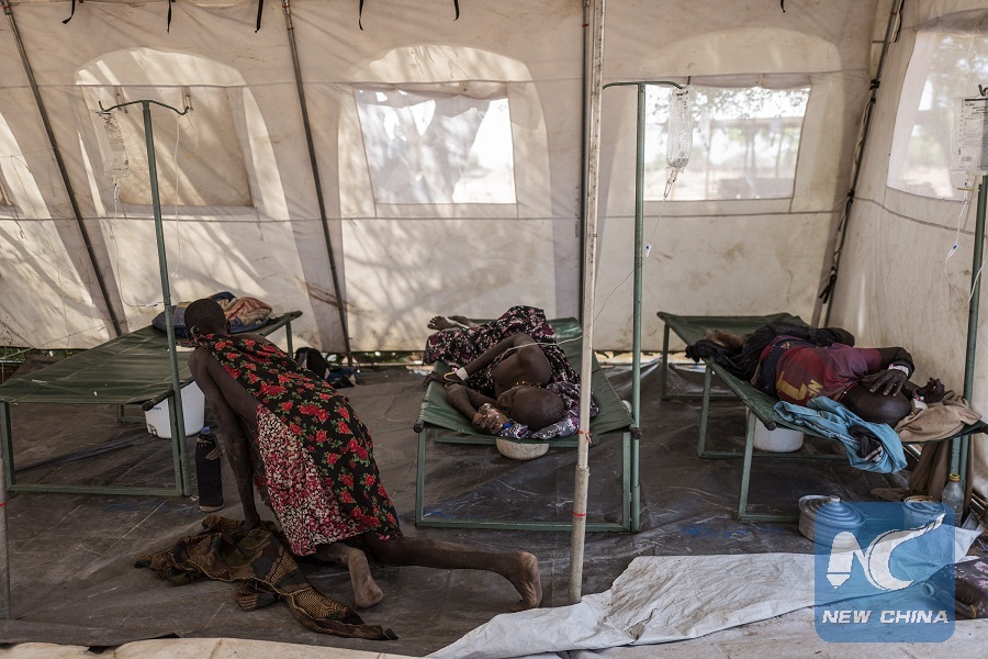 Patients suffering from cholera receive treatment inside a tent converted into a temporary field hospital near the remote village of Dor in the Awerial county in south-central Sudan on April 28, 2017. (Xinhua/AFP Photo)