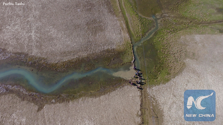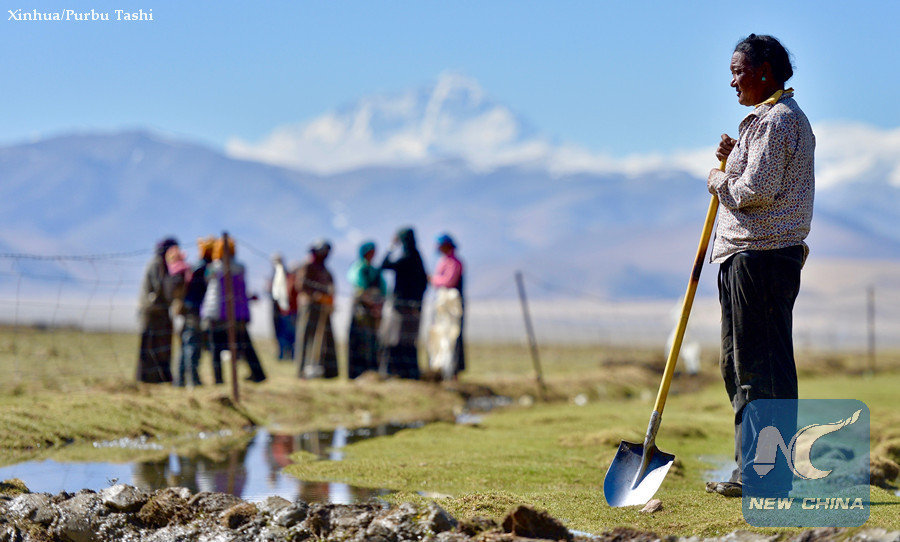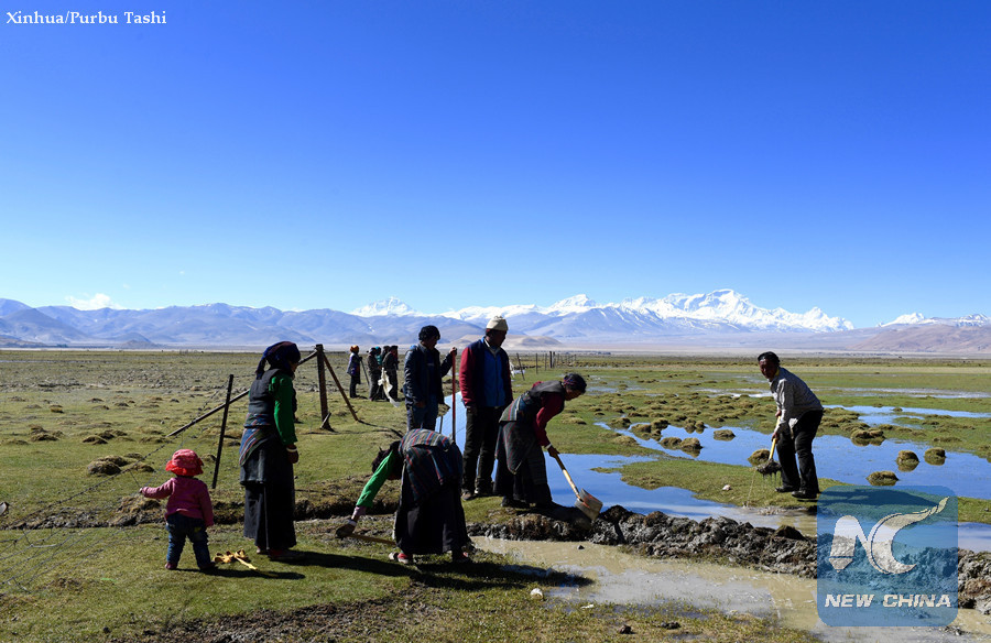 Villagers dig a ditch so that the wetland stay wet near the foot of Mount Qomolangma. (Xinhua/Purbu Tashi; Photo taken on May 17, 2017)