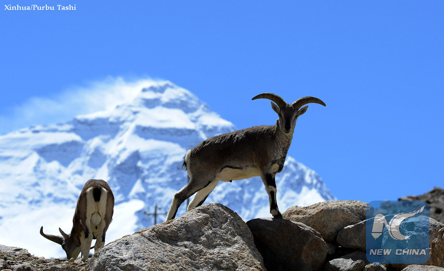 Photo taken on Sept. 22, 2016 shows blue sheeps near the foot of Mount Qomolangma. (Xinhua/Chogo)