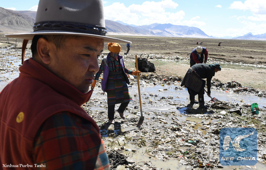 Villagers pick up garbage near the foot of Mount Qomolangma. (Xinhua/Purbu Tashi; Photo taken on May 17, 2017)