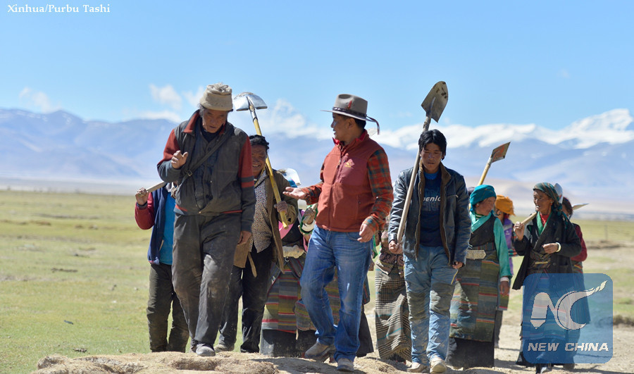 Villagers gather to dig a ditch near the foot of Mount Qomolangma. (Xinhua/Purbu Tashi; Photo taken on May 17, 2017)