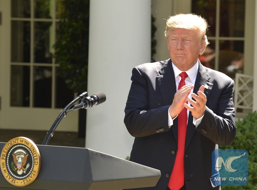The file photo shows that U.S. President Donald Trump applauds after delivering a speech at the White House in Washington D.C., capital of the United States, on June 1, 2017. (Xinhua/Mike Theiler)