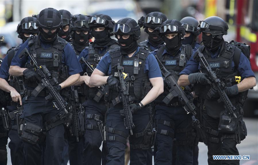 Armed police officers patrol near London Bridge after the terror attack took place on Saturday night in London, Britain on June 4, 2017. (Xinhua/UK OUT)