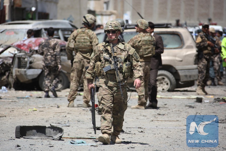 The file photo shows that U.S. soldiers inspect the site of suicide car bombing in Kabul, Afghanistan, May 17, 2015. (Xinhua/Ahmad Massoud)