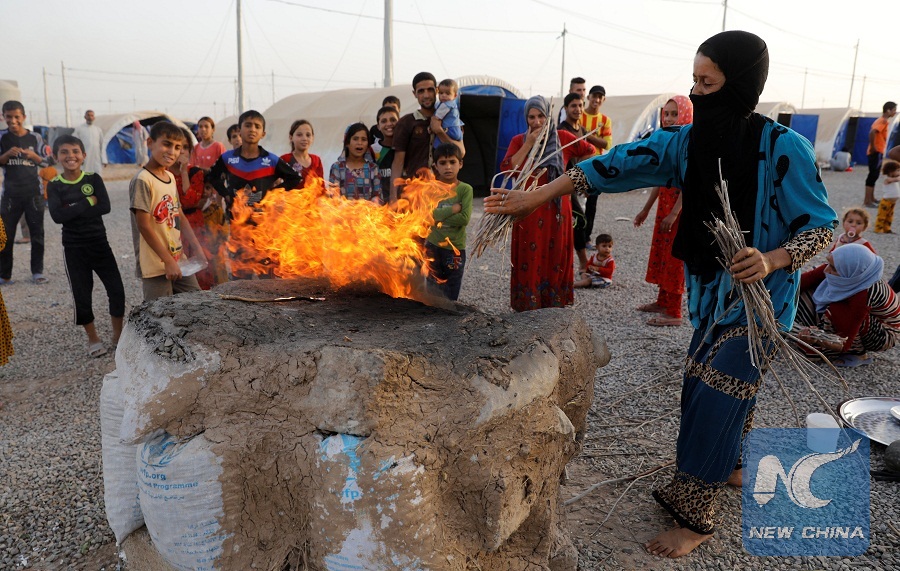 Evacuees watch a woman light a fire on a makeshift oven inside a refugee camp for people who fled from Mosul due to fighting between Iraqi forces and Islamic State militants, on the outskirts of Erbil, Iraq June 10, 2017. (Xinhua/Reuters Photo)