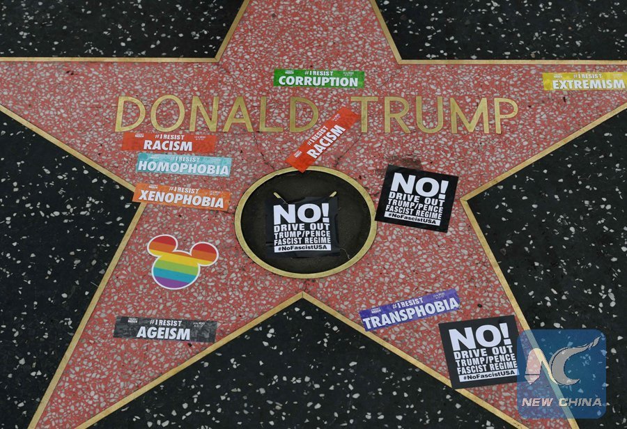 LOS ANGELES, June 12 (Xinhua) -- U.S President Donald Trump's star on Hollywood Boulevard was vandalized over the weekend during annual Gay Pride march in Los Angeles.