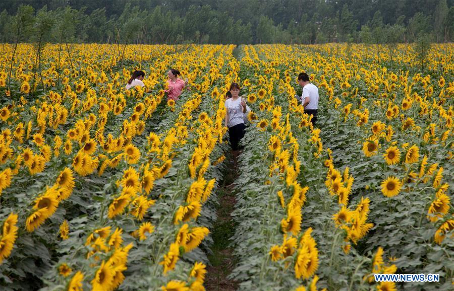 Tourists walk in the oil sunflower field in Zhaoxi Village of Zhaoqiao Township in Wuyi County, north China's Hebei Province, June 13, 2017. (Xinhua/Zhu Xudong)