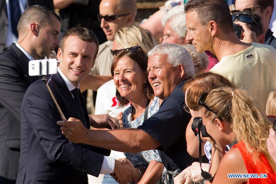 French President Emmanuel Macron poses for photo with his supporters after he voted at the city hall in the second round of the parliamentary elections in Le Touquet, France on June 18, 2017. (Xinhua/Kristina Afanasyeva)
