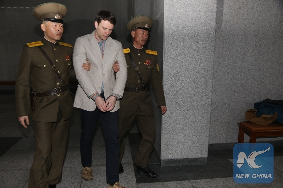 American student Otto Frederick Warmbier (C) arrives for his trial in Pyongyang, capital of the Democratic People's Republic of Korea (DPRK), March 16, 2016. Otto Frederick Warmbier was sentenced to 15 years of hard labor for anti-DPRK crimes, the DPRK Supreme Court announced Wednesday. (Xinhua/Guo Yina)