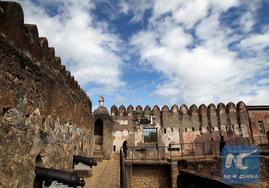 Photo taken on April 28, 2013 shows a scene of Fort Jesus in Mombasa, Kenya. The Fort, built by the Portuguese in 1593-1596 to the designs of Giovanni Battista Cairati to protect the port of Mombasa, is one of the most outstanding and well preserved examples of 16th Portuguese military fortification and a landmark in the history of this type of construction. The Fort's layout and form reflected the Renaissance ideal that perfect proportions and geometric harmony are to be found in the human body. The property covers an area of 2.36 hectares and includes the fort's moat and immediate surroundings. The UNESCO added the Fort Jesus to World Heritage List as a cultural site in 2011. (Xinhua/Meng Chenguang)