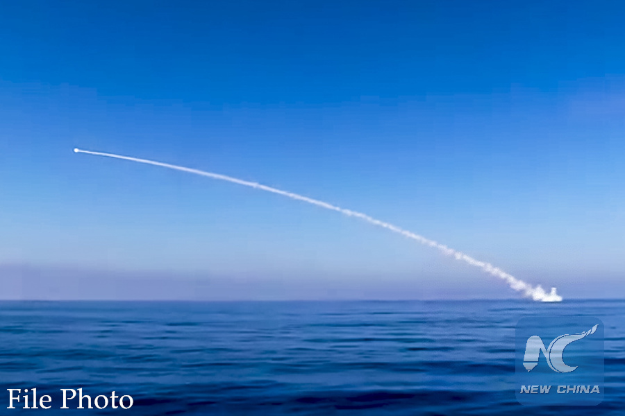 A still image taken from a video footage and released by Russia's Defence Ministry on May 31, 2017, shows a missile being fired from a Russian submarine to hit, Russian Defence Ministry said, Islamic State targets near the Syrian city of Palmyra, from the Mediterranean. (Xinhua/AP)