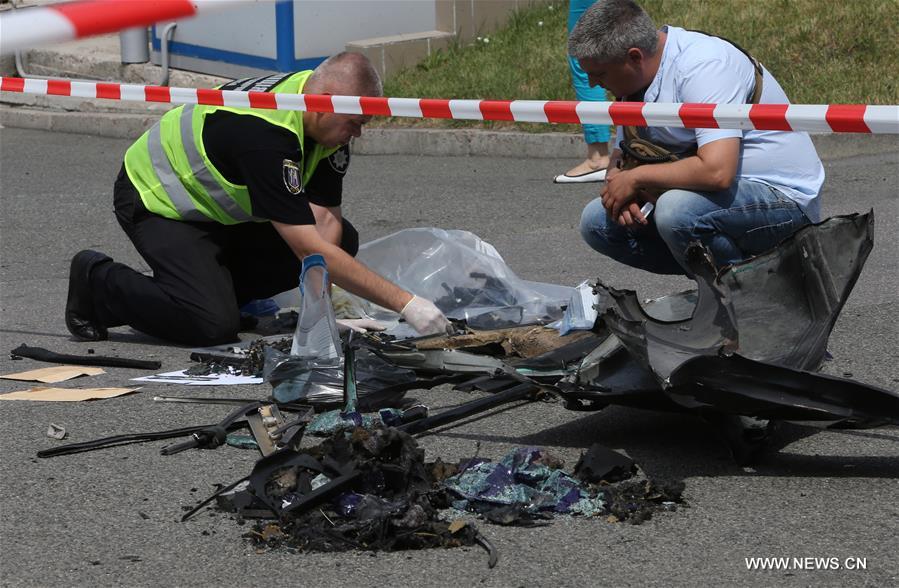 Investigators inspect the site of car blast in Kiev, capital of Ukraine, June 27, 2017. A senior Ukrainian intelligence officer was killed on Tuesday in a car blast in the capital city of Kiev, the Ukrainian Defense Ministry said in a statement. (Xinhua/Chen Junfeng)