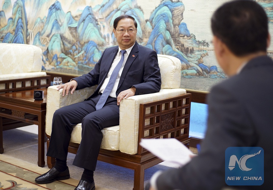 Chinese ambassador to Germany Shi Mingde receives an exclusive interview with Xinhua in Berlin, capital of Germany, on June 29, 2017. (Xinhua/Wang Qing)