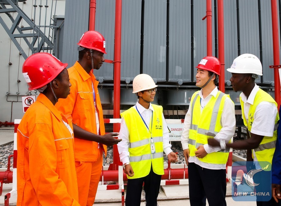 Chinese technicians Wang Guanguan (2nd R) and He Weijie (3rd L) talk with their Cote d'Ivoire's colleagues at the Soubre hydroelectric power station near the city of Soubre, in Cote d'Ivoire, on June 30, 2017. (Xinhua/Pan Siwei)