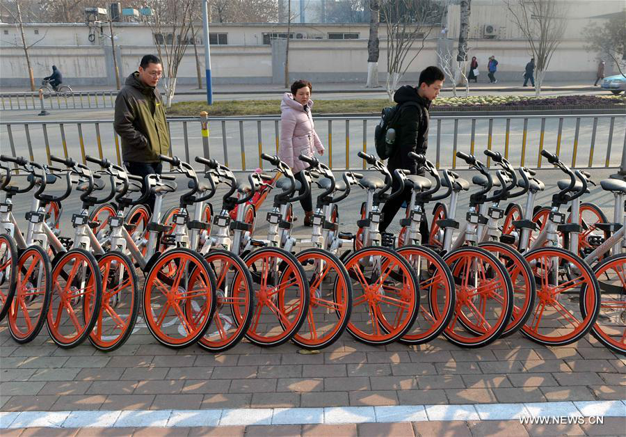Citizens pass bikes for sharing in Jinan, capital of east China's Shandong Province, Feb. 1, 2017. More than 11,000 bikes of an internet bike sharing system were put into use in Jinan recently. (Xinhua/Zhu Zheng)