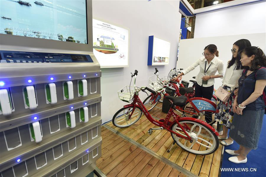 People view a sharing electric bike system at Hangzhou International Future Life Festival in Hangzhou, capital of east China's Zhejiang Province, May 27, 2017. The 3-day festival would show some technologies and solutions that may affect future life. (Xinhua/Li Zhong)