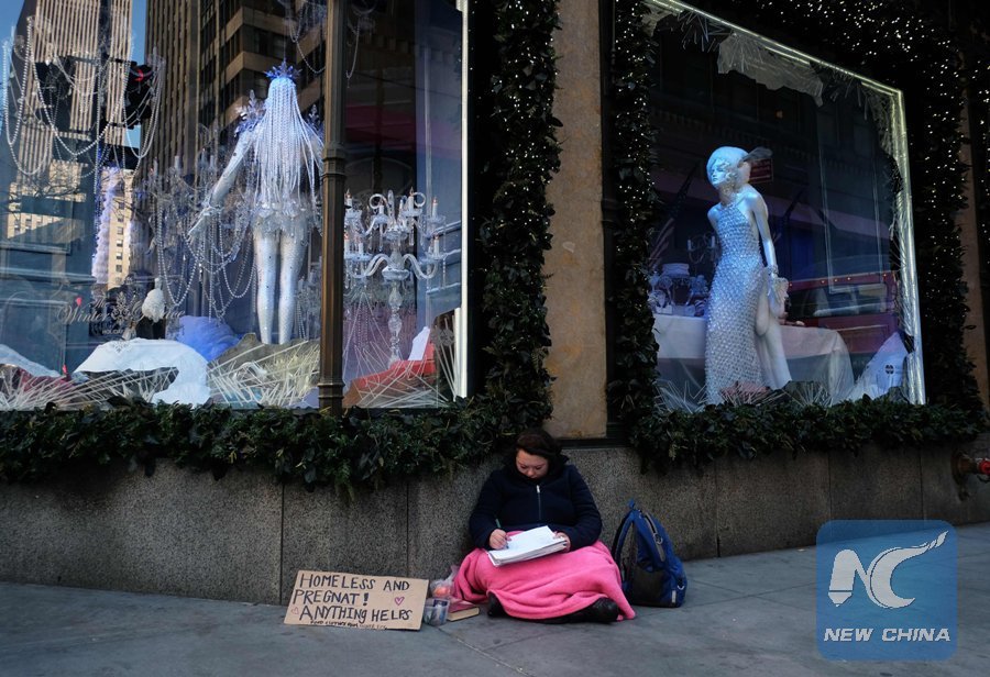This file photo taken on November 24, 2015 shows ahomeless woman in front of a store on Fifth Avenue in New York.