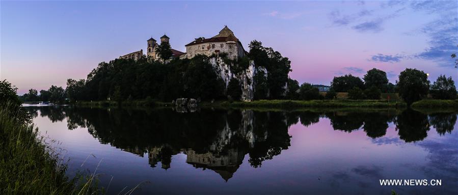 Merge photo taken on July 8, 2017 shows sunset at the ancient Benedictine Abbey of Tyniec near Krakow, southern Poland. (Xinhua/Chen Xu)