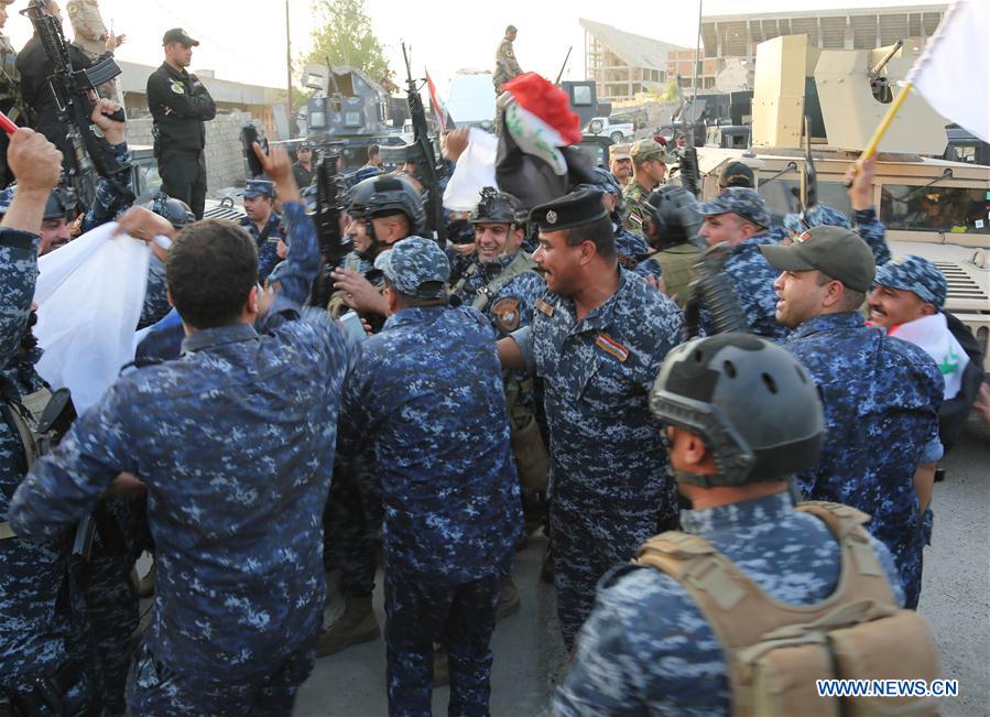 Iraqi soldiers attend a celebration for liberation of Mosul in Mosul, Iraq, July 10, 2017. Haider al-Abadi on Monday formally declared Mosul liberated from Islamic State (IS) militant group after nine months of fierce fighting to dislodge the extremist militants from their last major stronghold in Iraq. (Xinhua/Khalil Dawood)