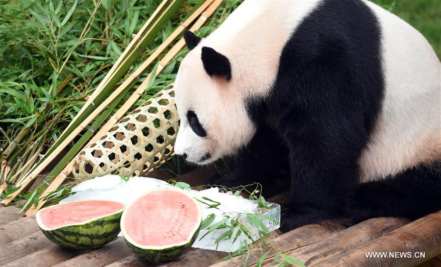 Chinese giant panda "Le Bao" eats its "birthday meal" at the zoo of Everland in the city of Yongin, South Korea, on July 12, 2017. The birthday for one of a pair of giant pandas, leased by China, was celebrated Wednesday at the zoo of Everland, South Korea's largest theme park located in Yongin, 40 km south of capital Seoul. (Xinhua/Newsis)