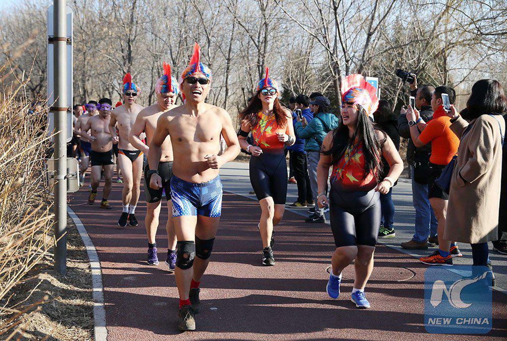 Participants run at the annual "naked pig run" at Olympic Forest Park in Beijing, China, Feb. 26, 2017. (Xinhua/Liu Xianguo)