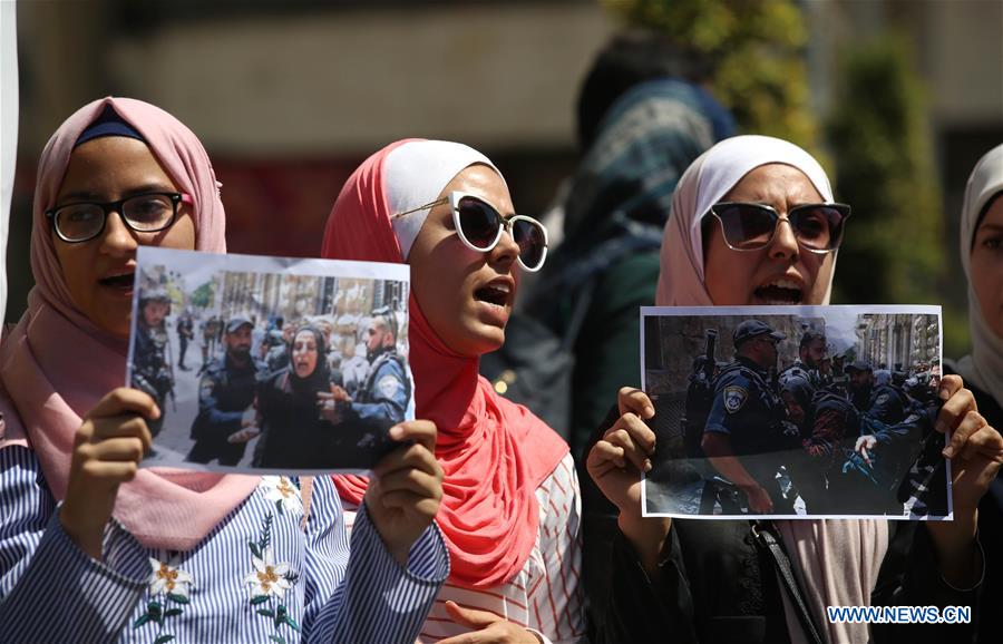 Palestinian women hold pictures of Israeli soldiers attacking women in the courtyard of the Al-Aqsa Mosque during a protest against the closure of the Al-Aqsa mosque compound in Jerusalem in the West Bank City of Nablus, on July 18, 2017. The Al-Aqsa Mosque was closed on July 14 after three Palestinians and two Israelis policemen were killed in an armed attack. Israel announced on July 16 the reopening of some of the entrances to Al-Aqsa Mosque gradually, after setting up electronic gates, surveillance cameras and sensitive equipment for "security reasons," which the Palestinians strongly rejected. (Xinhua/Ayman Nobani)