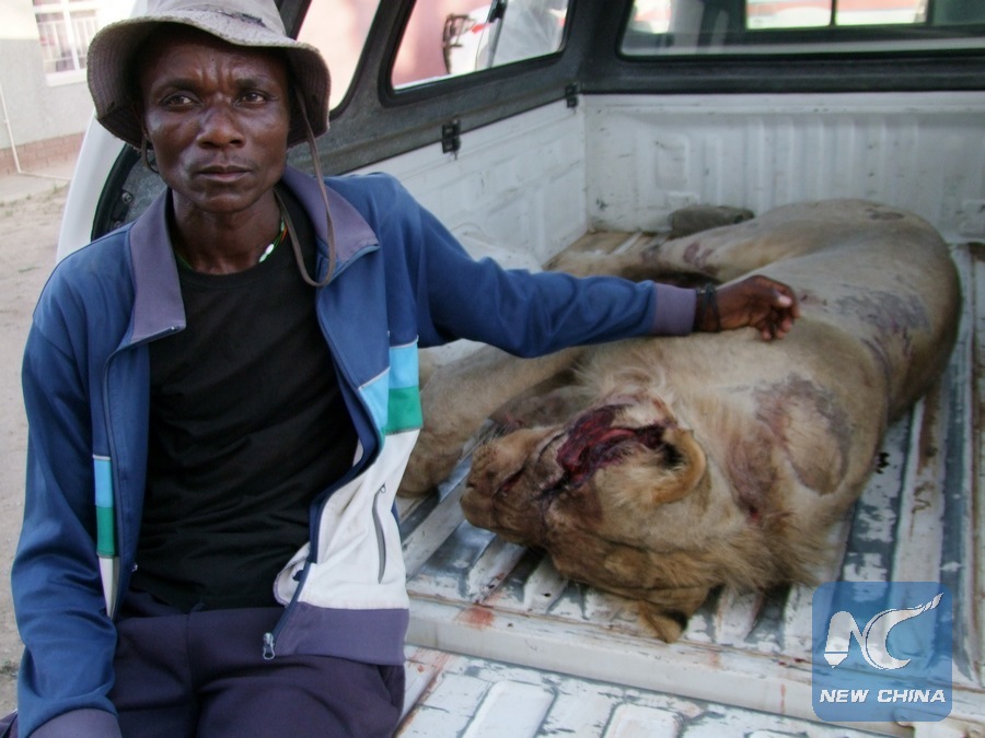 A man sits next to a dead lion at a village in Opuwo, north-western Namibia, Feb. 13, 2016. The man gunned down the lion after it killed a bull, a dog and left a cow wounded in Opuwo. (Xinhua/Nampa)