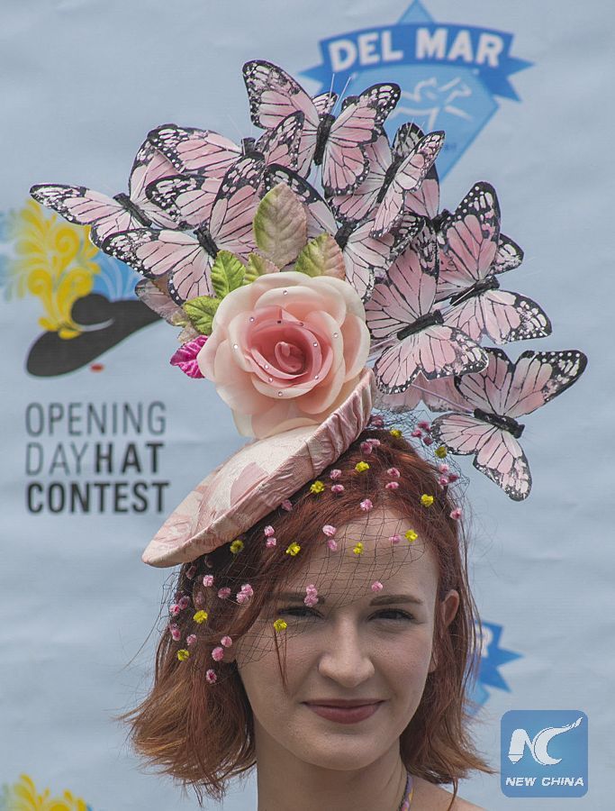 A contestant shows off her hat in the annual Opening Day Hats Contest during the Del Mar Thoroughbred Club Horse Racing Track opening day on Wednesday July 19, 2017 in Del Mar, California, the United States. (Xinhua/Javier Rojas)