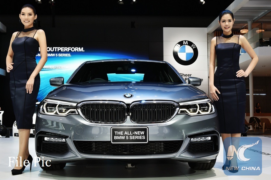 Two models present a new BMW 5 Series car during a press preview of the 38th Bangkok International Motor Show at the Muang Thong Thani exhibition centre in Bangkok, Thailand, March 28, 2017. (Xinhua/Li Mangmang)