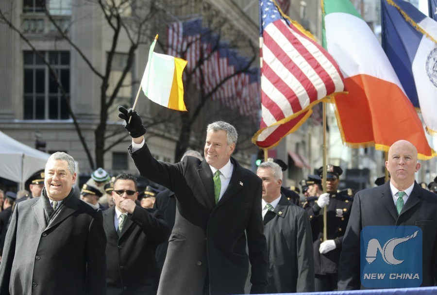 New York City's mayor Bill de Blasio (C front) takes part in the St. Patrick's Day Parade in New York, the United States, on March 17, 2017. (Xinhua/Wang Ying)