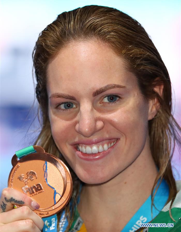 Bronze medalist Emily Seebohm of Australia poses during the awarding ceremony for the women's 100m backstroke swimming final at the 17th FINA World Championships in Budapest, Hungary on July 25, 2017.(Xinhua/Gong Bing)
