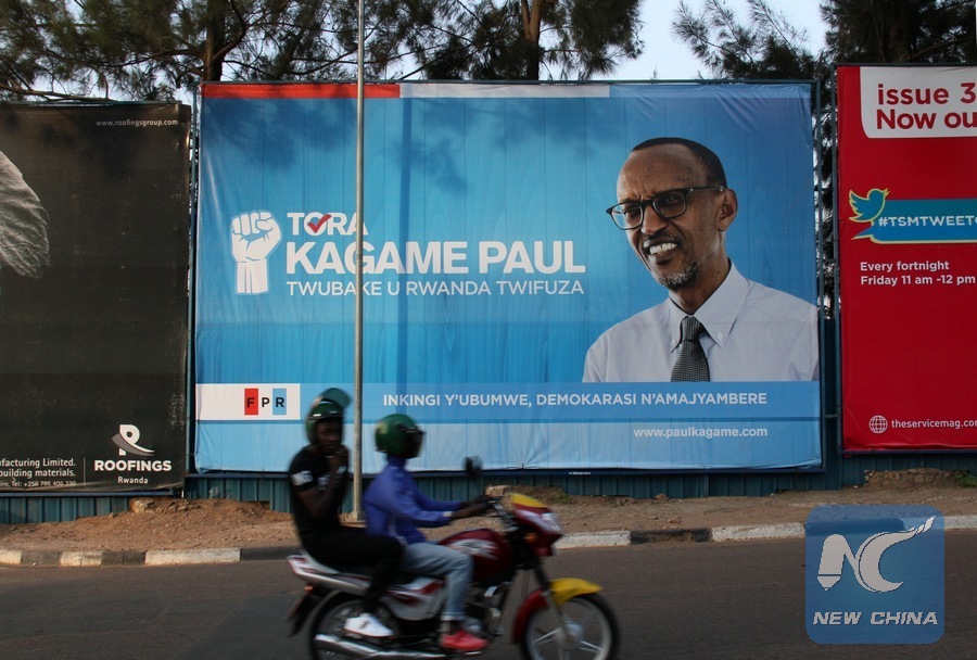 A billboard of Rwandan presidential candidate and the incumbent President of Rwanda Paul Kagame is seen along a street in Kigali, capital of Rwanda, July 30, 2017. Rwandans will go to polls on August 4 to decide the presidency for the next seven years. (Xinhua/Lyu Tianran)