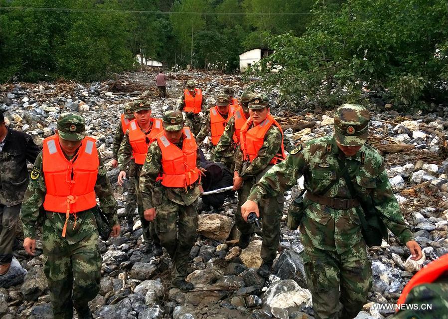 Rescuers evacuate stranded villagers in Baima Village, Wenxian County of northwest China's Gansu Province, Aug. 8, 2017. Seven people have died and two others remain missing after a flood here. Rainstorms hit three townships in Wenxian county from Sunday evening to Monday morning, resulting in geological disasters including landslides. (Xinhua/Feng Dong)