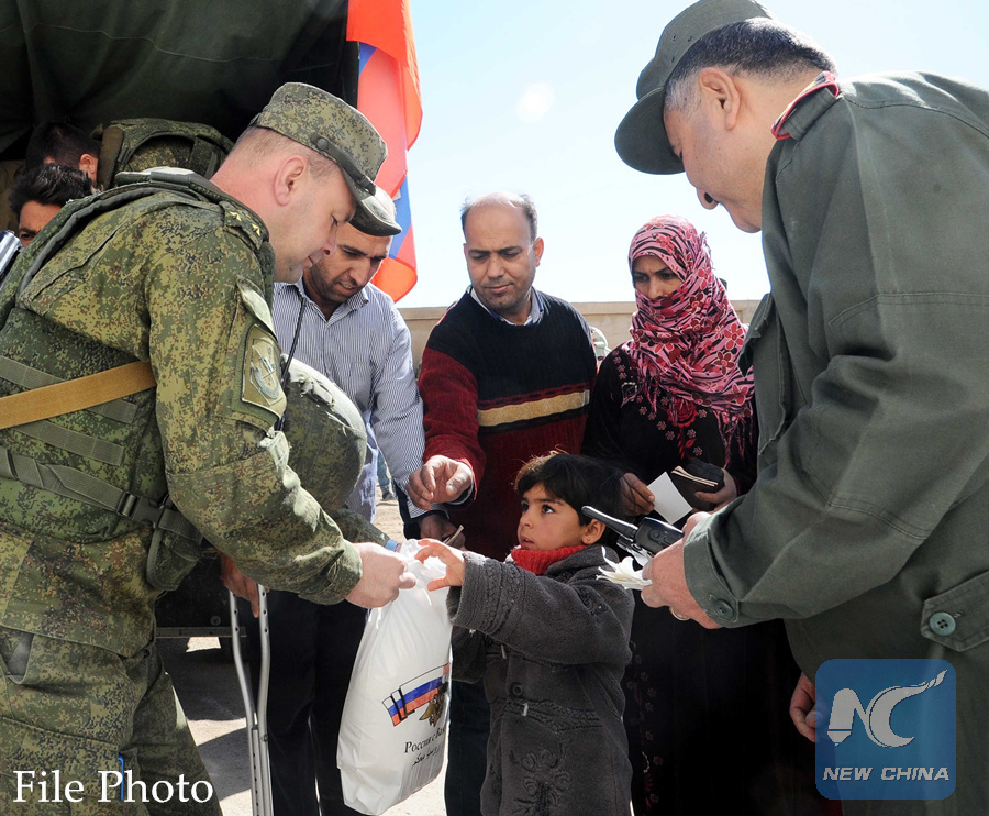 A Russian soldier hands a pack of aid to a kid in Damascus, Syria, Nov. 24, 2016. (Xinhua/Ammar Safarjalani)