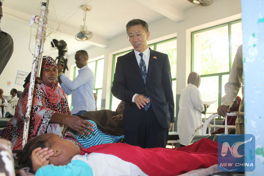 Chinese Ambassador to Somalia Qin Jian visits patients admitted at the Banadir Hospital in Mogadishu, capital of Somalia, Aug. 9, 2017. (Xinhua/Faisal Isse)