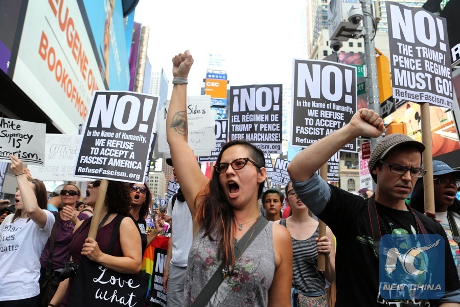 Protesters chant slogans against white nationalism in Times Square in New York City, the day after the attack on counter-protesters at the "Unite the Right" rally organized by white nationalists in Charlottesville, Virginia, U.S., August 13, 2017. (Xinhua/REUTERS)