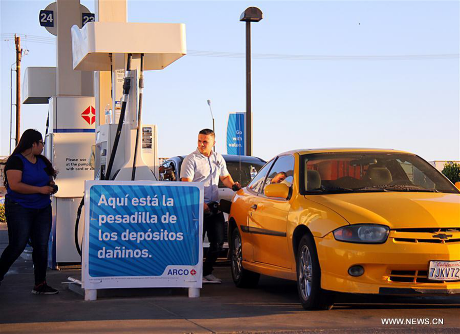 Customers fill gas at Arco gas station in Heber, Imperial County, the United States, which is seven kilometers away from the United States border inspection station bordering Mexico, on Aug. 16, 2017. (Xinhua/Guo Shuang)