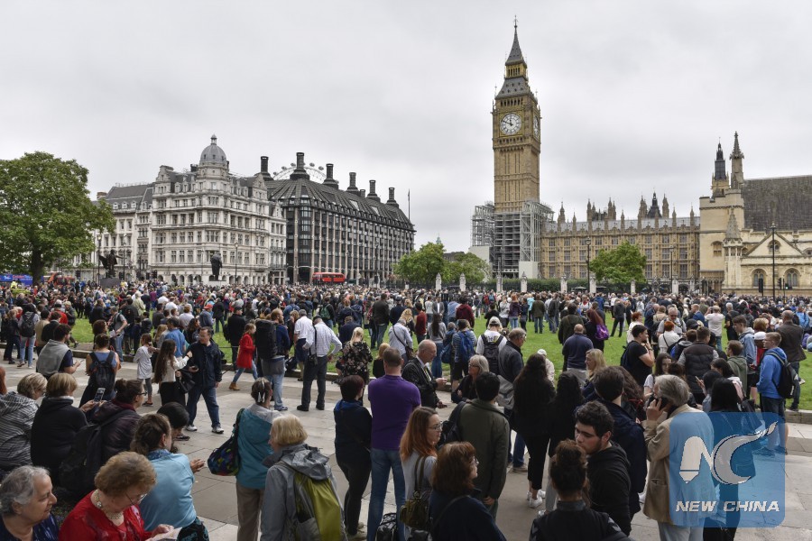 People gather in front of the Big Ben in central London, Britain on Aug. 21, 2017. London's famous Big Ben chimed for the last time on Monday when the famous Great Bell fell silent until 2021. (Xinhua/Stephen Chung)