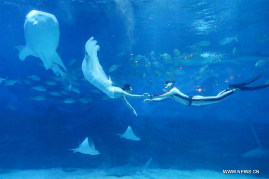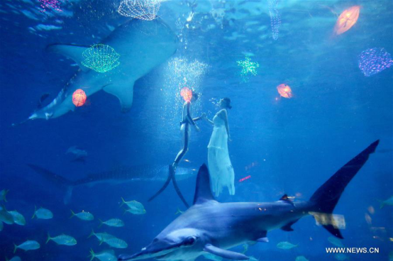 Divers perform during an underwater wedding show at the Haichang whale and shark aquarium in Yantai, east China's Shandong Province, Aug. 26, 2017, to greet the Qixi festival, or Chinese Valentine's Day. (Xinhua/Tang Ke)