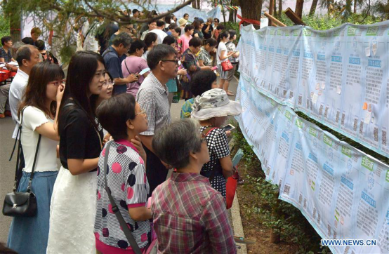 Citizens watch people's information during a matchmaking event in Jinan, capital of east China's Shandong Province, Aug. 25, 2017. A four-day matchmaking event was held at Qianfoshan mountain before the Qixi festival, or Chinese Valentine's Day. More than 7,000 people submit their personal information to join the event. (Xinhua/Xu Suhui)