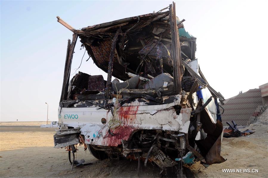 A bus damaged in the accident is seen at the bus-truck collision site in the Egyptian province of Beni Suef, Aug. 29, 2017. A bus collided with a truck in the Egyptian province of Beni Suef, killing at least 14 and wounding 42 others, Egypt's Health Ministry said Tuesday. (Xinhua/STR)