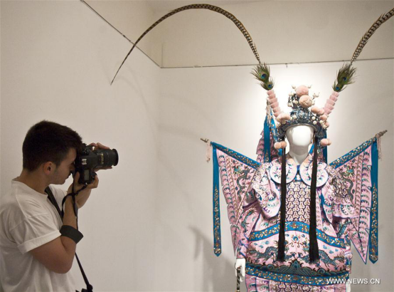 A visitor takes photos in the Chinese Opera Exhibition in Elefsina, Greece, on Aug. 10, 2017. (Xinhua/Liu Yongqiu)