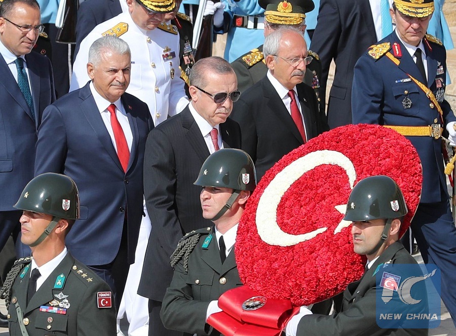 Turkish President Recep Tayyip Erdogan (C) and Turkish Prime Minister Binali Yildirim (2nd L) attend a ceremony marking the 95th anniversary of Victory Day, commemorating a decisive battle in the Turkish War of Independence, at the mausoleum of Mustafa Kemal Ataturk in Ankara on August 30, 2017. (AFP Photo)